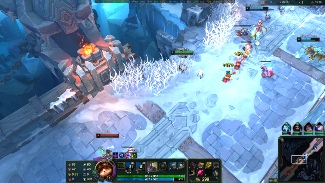 游戏模式下,我们以1080P分辨率、阴影效果、画面质量、抗锯齿等效果拉到最高运行英雄联盟游戏,测试结果显示游戏过程中帧率稳定在118FPS左右,GPU显卡占用率41%,内存占用率74%,由于LOL不需要太多性能,显卡性能发挥并不充分,火影T5V可在低温环境流畅运行游戏。
