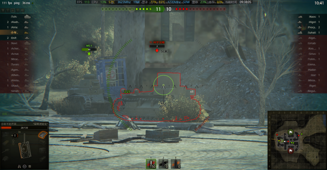 游戏模式下,以最高画面质量运行坦克世界游戏,PVE模式下游戏帧率维持在113帧左右,显卡占用率在77%左右,运行频率可超频至1770MHz,显卡性能调用充分。