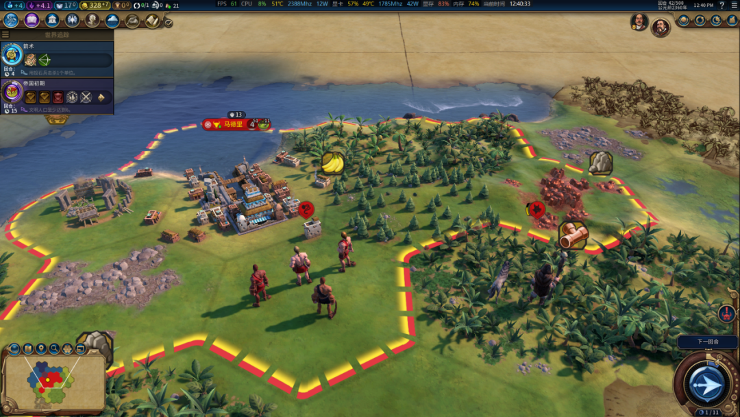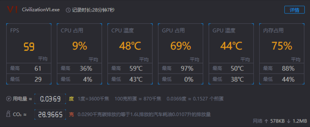 模拟类游戏CivilizationVI中,游戏模式下以最高画面质量、阴影效果运行游戏,显卡占有率为69%,内存占有率为75%,显卡性能调用得当。