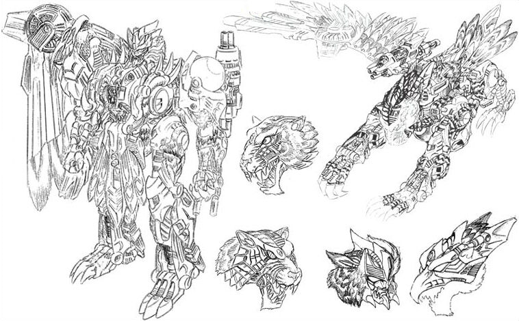 野兽形态下有着鹰和虎特征的生物机械结构,并且由于金属变体时期玩具开模技术的进步,可以在模具上体现更多的细节,虎鹰的身体也采用了不对称设计。在左侧会有更多的毛发、肌肉纹理,而在右侧有大量金属机械结构纹理。可惜模具白色部分没有细节涂装,大量的细节只有仔细近距离观察才能看见。
