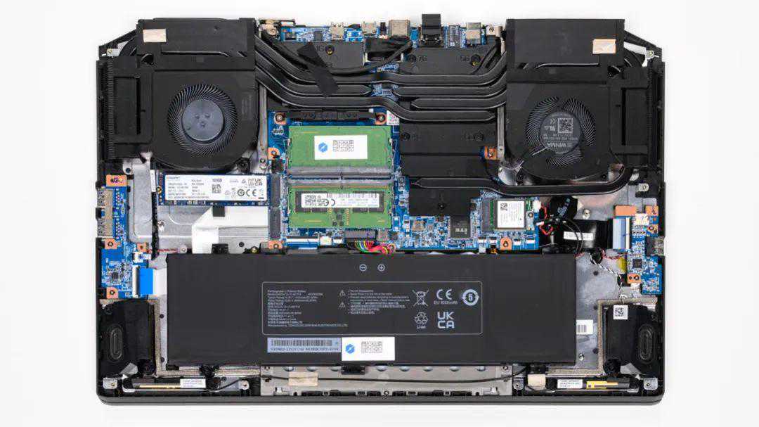 上图是机械革命蛟龙17KS的拆机实拍图,六热管双风扇的组合,和蛟龙17K一致,是同方国际旗下的典型设计。