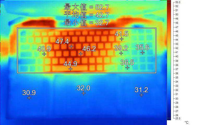 表面温度如上图所示,键盘键帽最高47.4℃出现在“Y”键上,WASD键附近约为40.9℃,方向键36.5℃。左腕托温度为30.9℃。