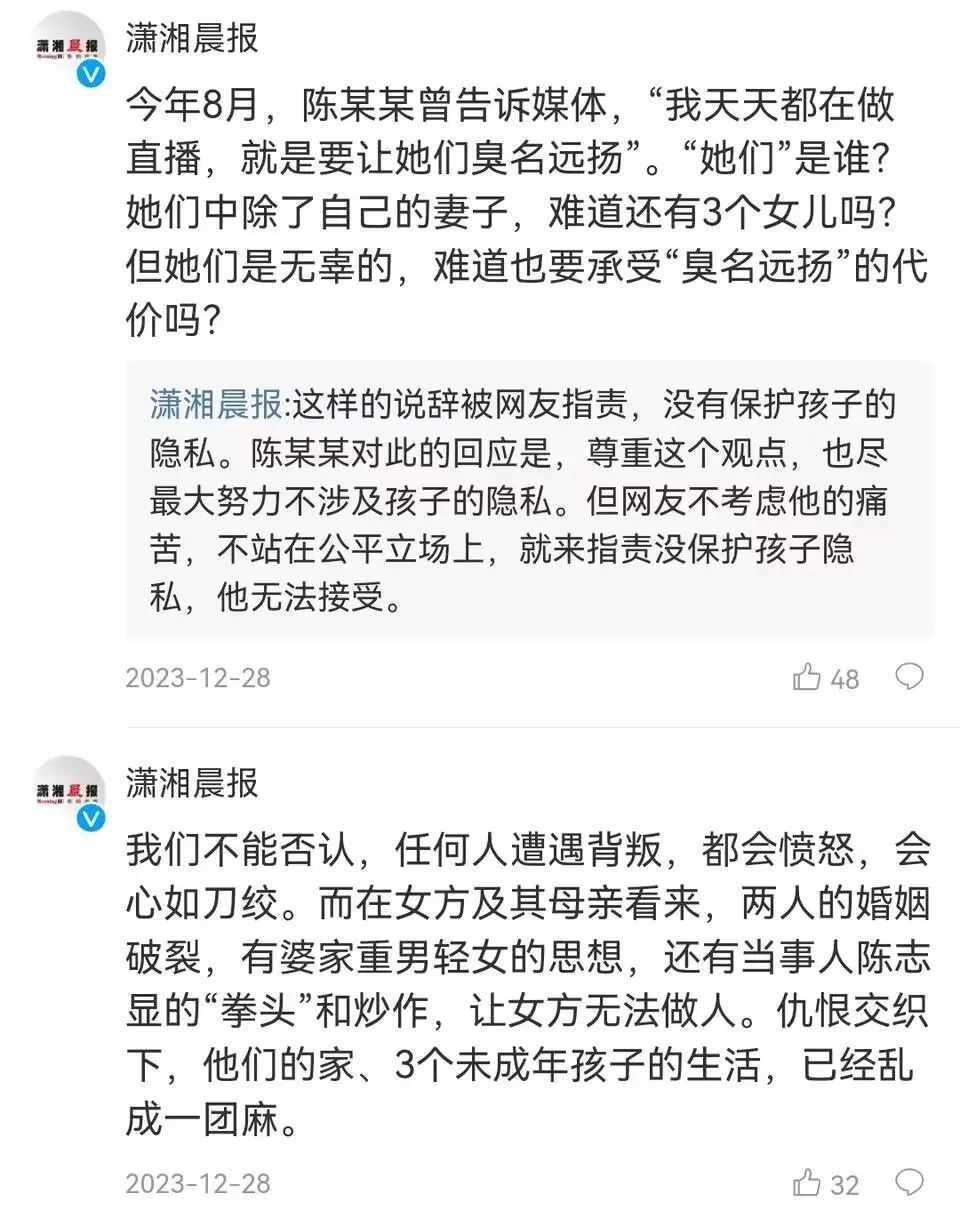 湖南某媒体在微博说,抛开女方出轨、转移夫妻共同财产、生育诈骗不谈,陈显志之所以会这么倒霉,是因为他家重男轻女,他在发现老婆出轨后居然敢打人。