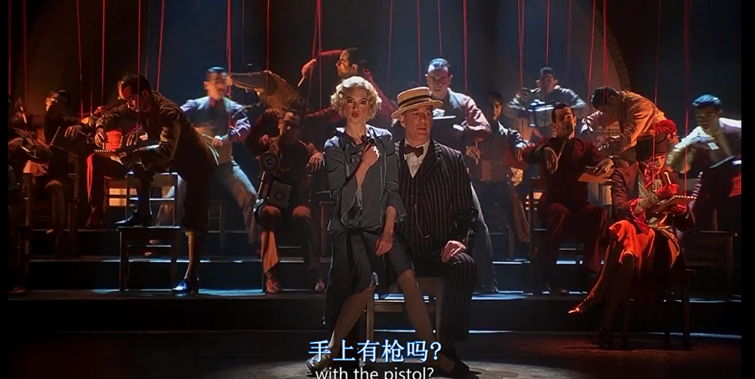 这里莫顿出场的歌舞有一个细节,莫顿从胸前抽出了一条绿色丝巾,丝巾暗喻的是美元,说明莫顿就是监狱加钱哥,认钱不认人。后面的歌舞桥段里还会多次出现这种隐喻用的丝巾。