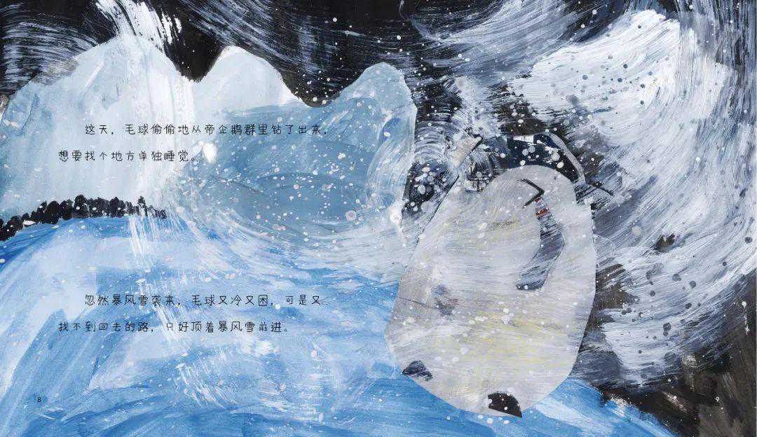 一天,帝企鹅家族抱团睡觉时,毛球发现成年帝企鹅总是会围成一圈,保护着里面的小帝企鹅。毛球心想如果它敢独自去睡觉,是不是就可以证明自己是一只勇敢的小帝企鹅呢?于是它偷偷地从企鹅群里溜了出来,孤身踏上了冒险的旅程。
