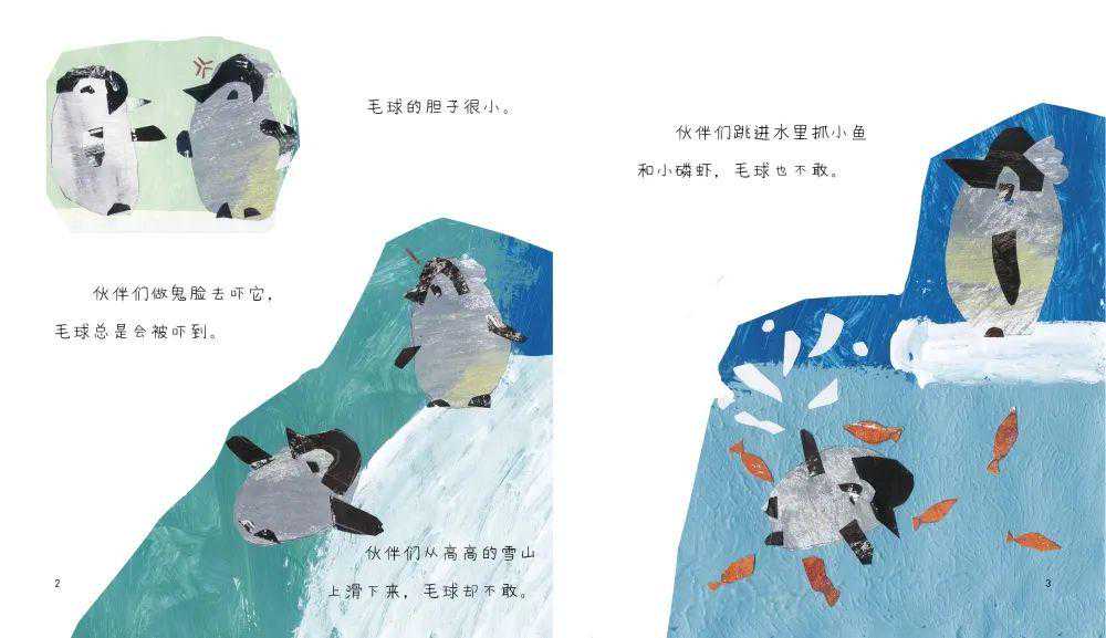 毛球是一只住在南极的小帝企鹅,它和其他的小帝企鹅不太一样。当伙伴们开心地从高高的雪山上滑下来时,毛球却站在山顶畏畏缩缩,始终不敢往下跳;当伙伴们一跃跳进大海,捕食着小鱼和磷虾时,毛球却望着深不见底的海水,迟迟不敢下去。毛球越来越“不合群”,伙伴们都嘲笑它是个胆小鬼。这让毛球很难过,它想要变得勇敢。