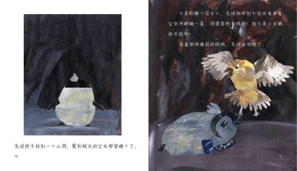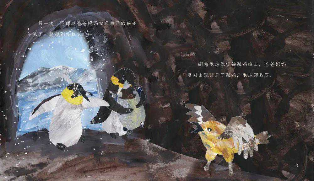 没有成年帝企鹅为它遮风挡雪,小小的毛球很快就迷失在狂风暴雪之中。它既寻不到回家的道路,也找不到任何栖身之所,只好硬着头皮顶着风雪一路前行。又冷又困的毛球走了很久很久,终于找到一个可以睡觉的山洞。可是它刚躺下没多久,山洞里居然出现了小帝企鹅的天敌——贼鸥。危险近在咫尺,好在毛球的父母及时赶到,才避免了悲剧的发生。受到惊吓的毛球扑向了妈妈的怀抱,在妈妈的询问下,毛球说出了自己的心事……