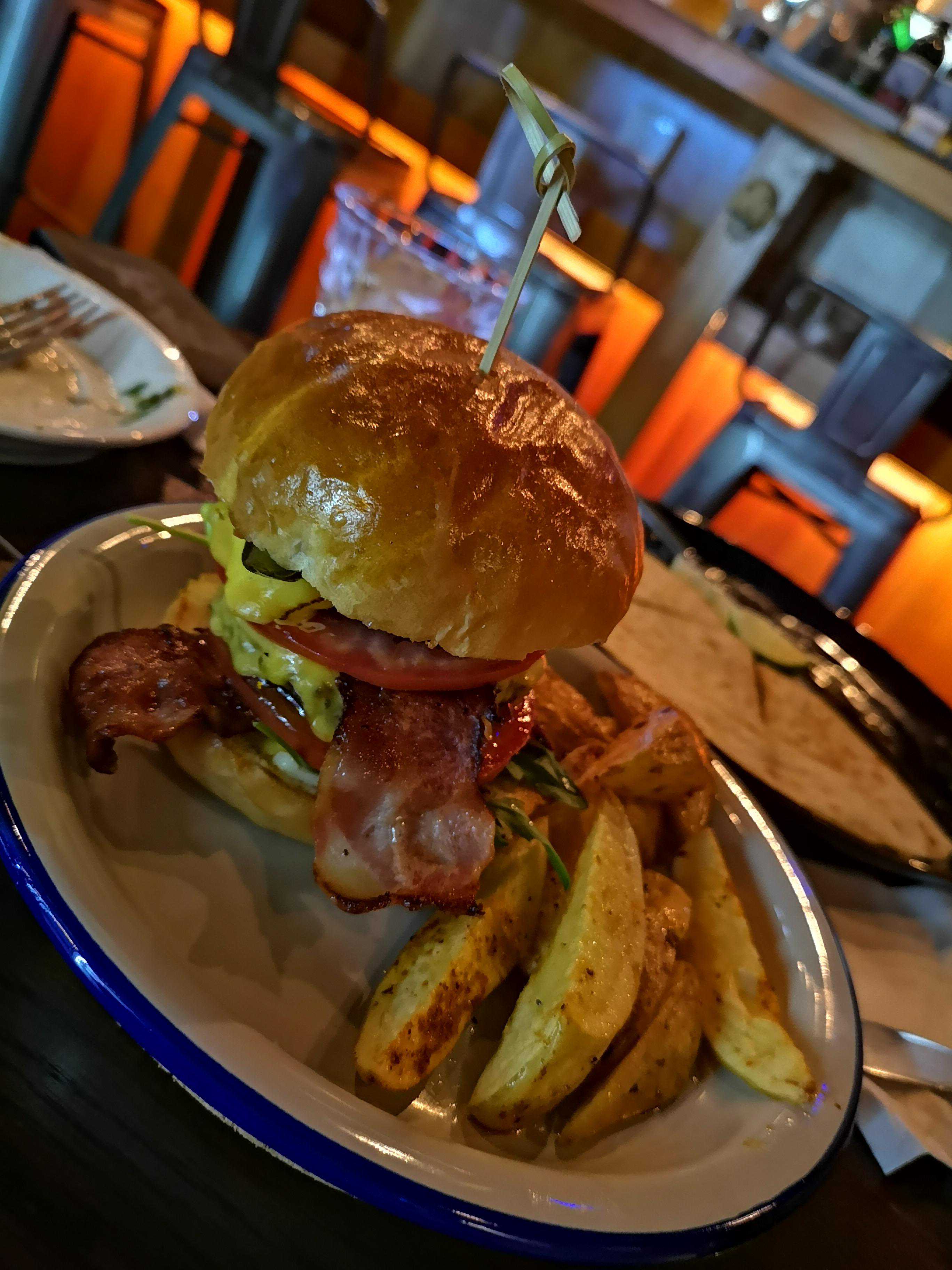 推荐疤面煞星,厚实的牛肉饼搭配培根、香肠、西红柿、车打奶酪,还配有一些薯角,满满的卡路里啊,但是味道真不错。汉堡中的酱汁味道很独特,吃着微微香辣淡淡香甜。从视觉上看会觉得汉堡不大,但是正常饭量的朋友一个下肚就觉得饱了,建议两人食用,切开一人一半,毕竟还有其他的好吃哒。