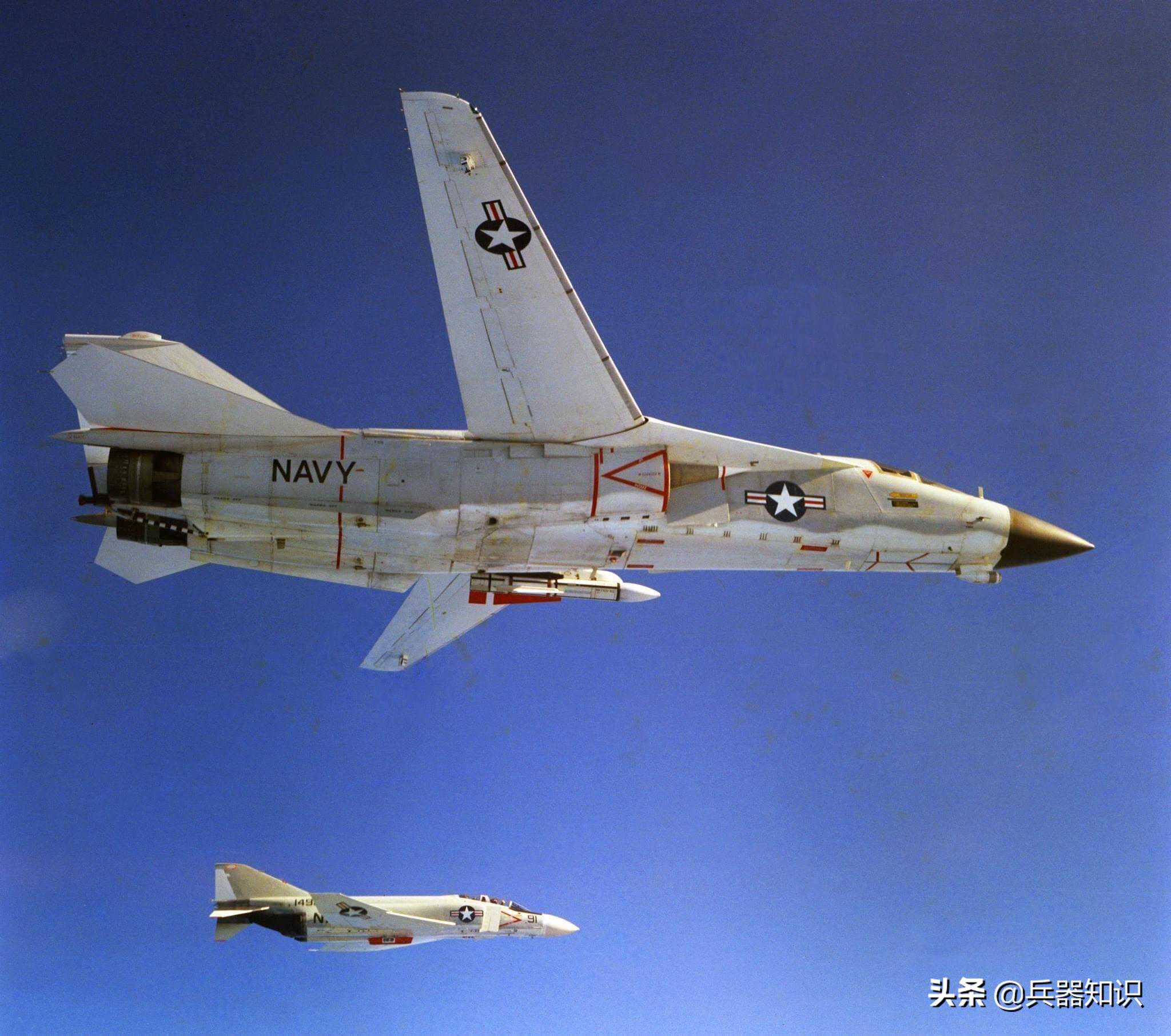 ▲编队飞行的F-4战斗机和F-111战斗轰炸机,F-111战斗轰炸机挂载了1枚AIM-54“不死鸟”空空导弹