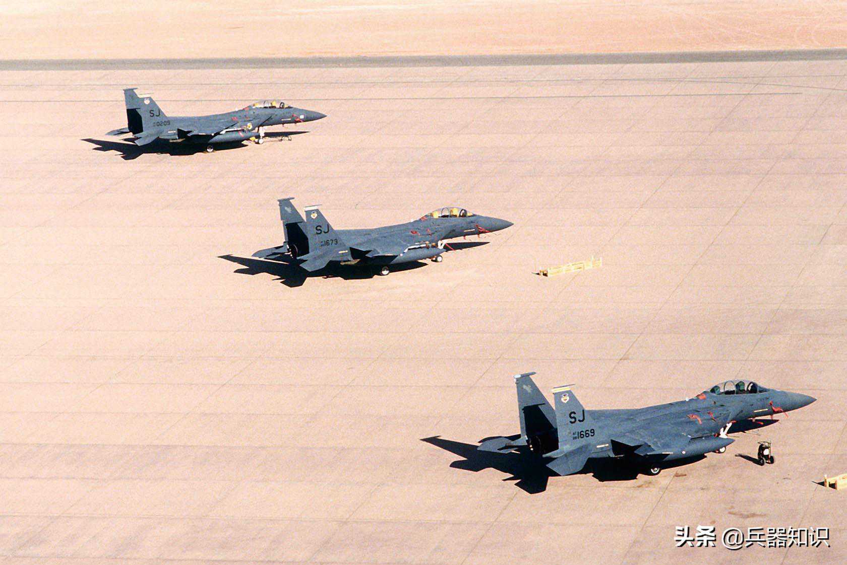 ▲1990至1991年期间,美空军第4战术战斗机联队的F-15E“攻击鹰”战斗机在沙特境内的海尔季驻扎