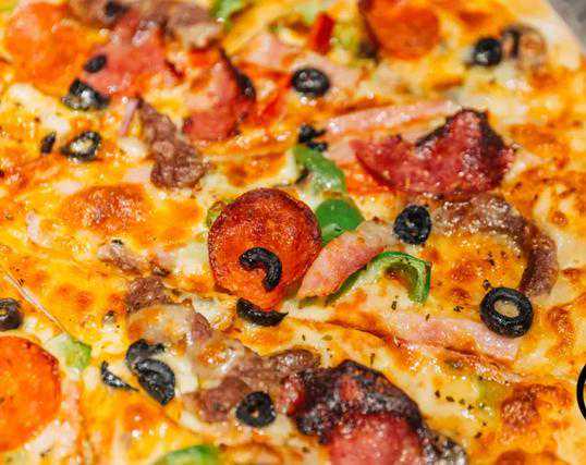 加入马祖里拉奶酪,黑橄榄,萨莱米,猪肉粒…用料超齁实。一眼扫去,肉欲横流,多种高级食材在舌尖混搭交织出复杂的口感,满足。