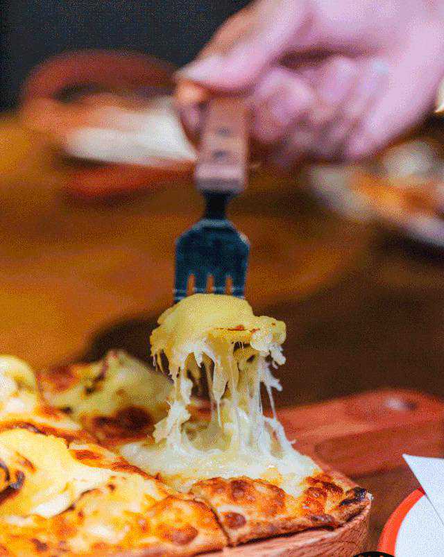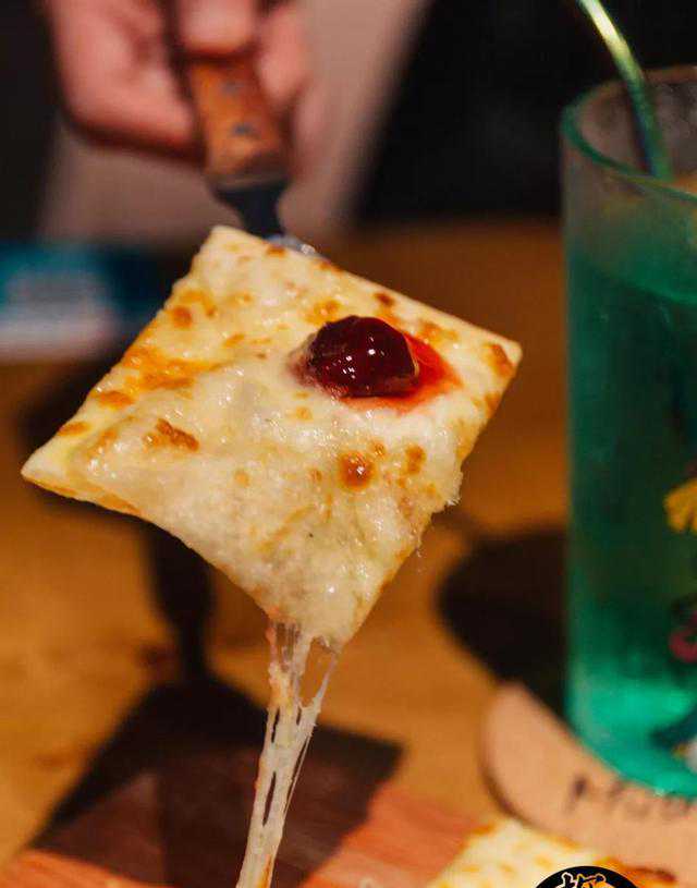 多到爆出的榴莲果肉和厚厚一层的马苏里拉芝士霸道地占据了整个饼底。咬一口,立马能感受到手打的榴莲果肉在舌尖爆浆,细腻绵滑,一直滑到胃里去。