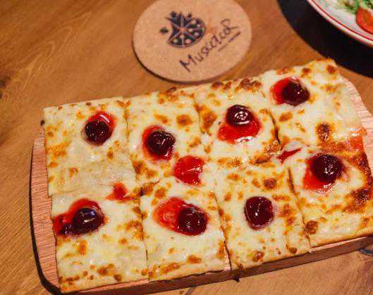 喜欢酸甜口的,推荐可心樱桃西西里纽约片。每一片榴莲Sfincione上都点缀着晶莹剔透的大颗樱桃。