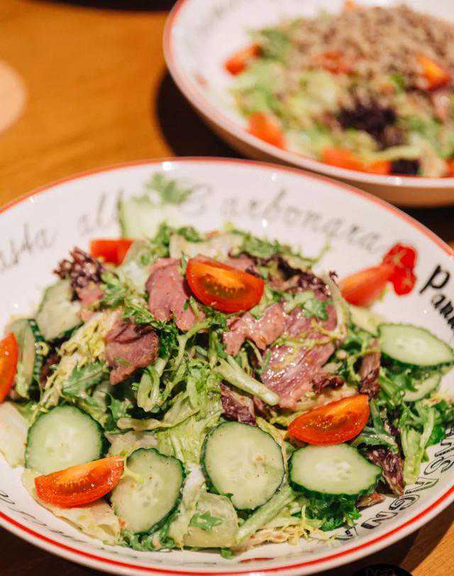 适合减肥的肉食主义者,同样低卡的烤牛肉沙拉,高蛋白的多汁嫩牛肉搭配高纤有色鲜蔬,和披萨一起吃又是一道解腻轻食。