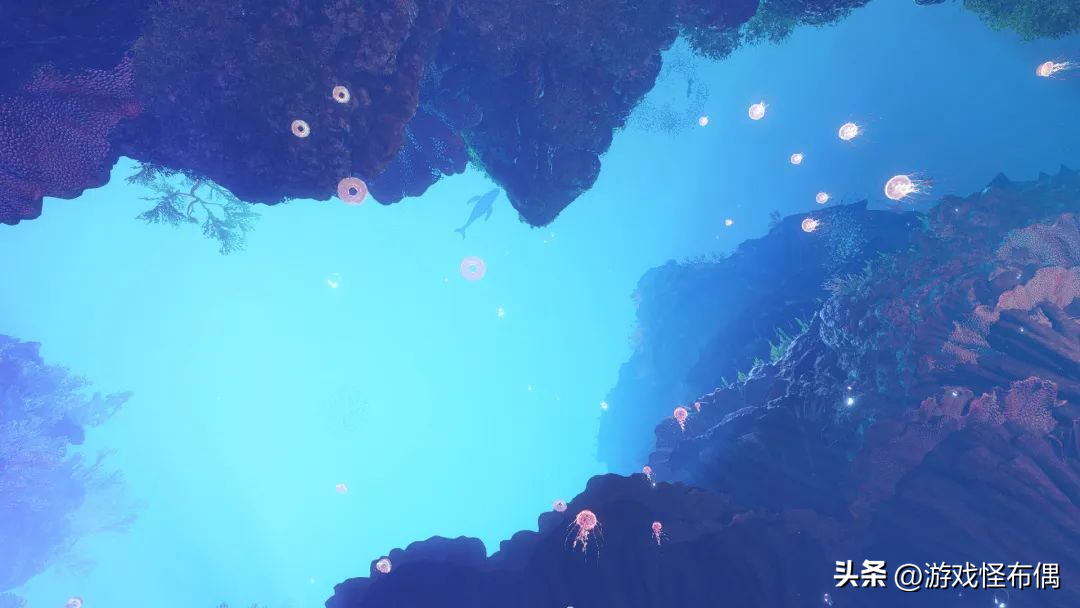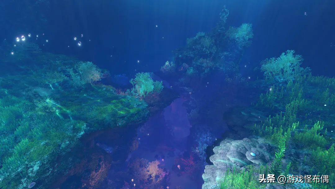 再往下潜,海面上映射的阳光逐渐被周遭的发光珊瑚替代,各色光芒的映衬下,将海底世界装点的梦幻气息十足,让人仿佛置身于龙宫仙境一般。