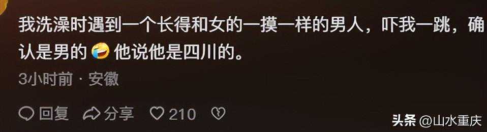 我洗澡时遇到一个长得和女的一模一样的男人,吓我一跳,确认是男的,他说他是四川的。