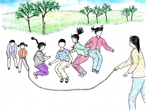 一根绳子,抡起来,小朋友排着队往里面跳。也可以单人自己跳,曾经还是中考体育项目之一呢,现在不清楚还有没有了。