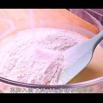 3、再加入剩下的100g面粉与4g盐,把面团翻拌成形。