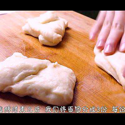 8、2次发酵后,放到操作台上,将面团分成3份,每一份125g。