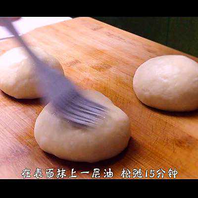 9、将面团预整形,滚圆,在面团表面抹上一层油,盖保鲜膜松弛15分钟。