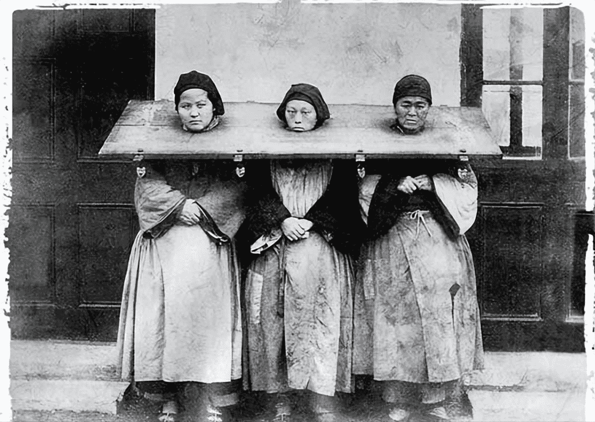 1885年的上海,三名女性囚犯,带着连枷示众