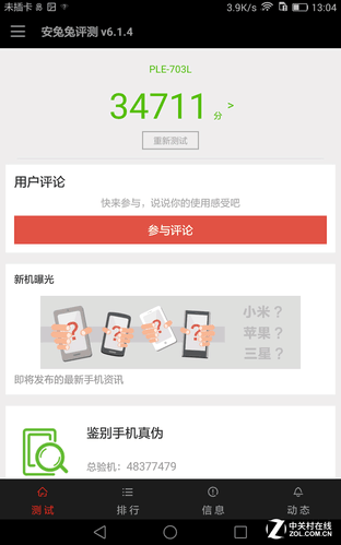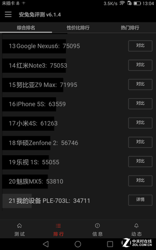 首先还是用安兔兔进行一下跑分,安兔兔目前作为Andriod平台上广泛使用的一款跑分软件,包括了3D测试场景、UX测试项目、CPU性能测试等等,虽然近期的升级使得评价标准出现的变化,但其分数在同一平台下仍具有参考价值。