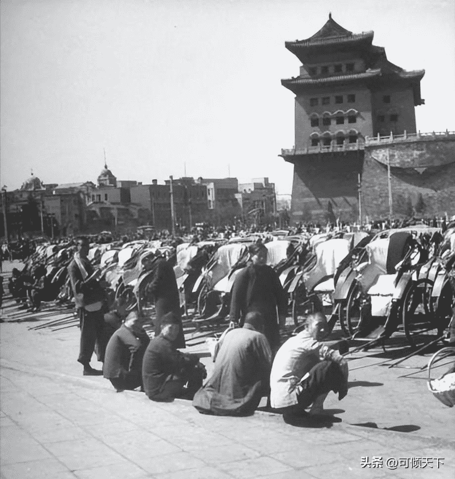 一群底层的拉车车夫坐在各自的黄包车旁边,