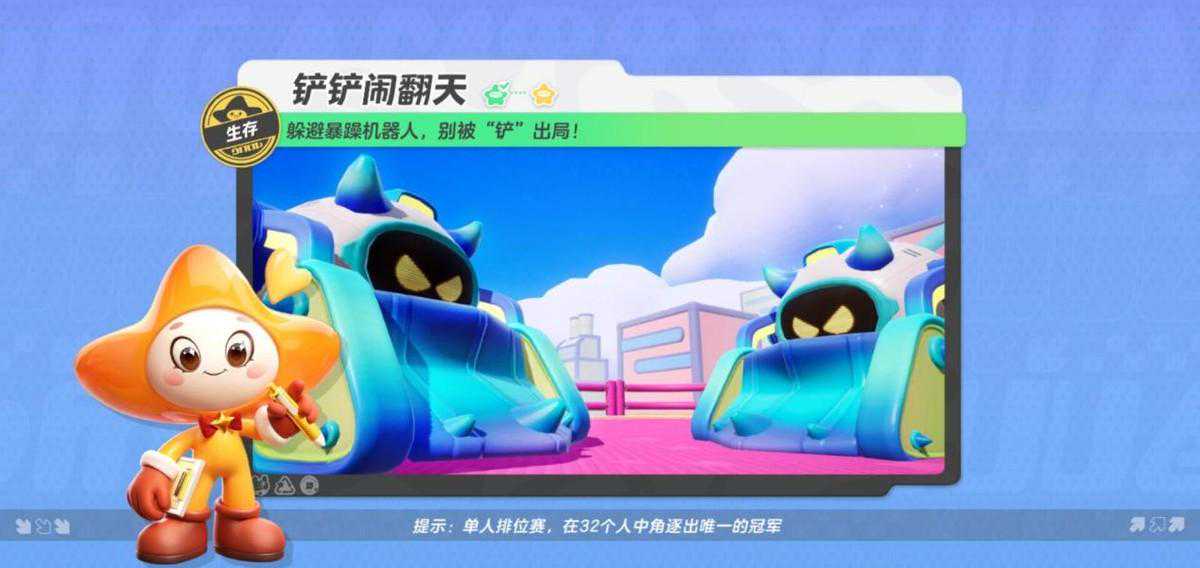 《元梦之星》的生存模式中有这么一张图,是星宝们直接与铲车机器人进行对抗的地图。这个地图是在排位赛中会出现的一张生存赛地图。这个地图中所有的星宝会集中在一个擂台上,对于玩家们来说,既是和铲车机器人的比拼,同时还是和其他星宝的比拼。