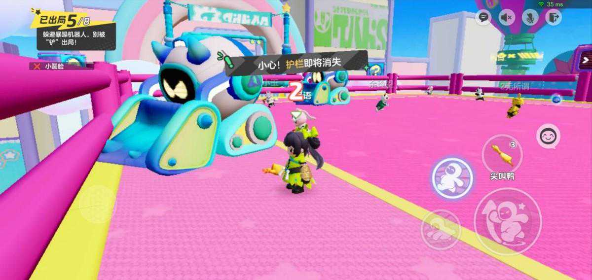 第二个阶段就是护栏解除的阶段了。这个阶段玩家可以用尖叫鸡、地雷等道具将其他玩家给丢出擂台外。所以,在第一个阶段的时候我们就必须要积累道具以便于第二个阶段使用,这边我个人推荐尖叫鸡、地雷,尖叫鸡有三次挥打机会,很适合攻击那些在经常在擂台周边游走的星宝。地雷则是因为放置得当的话,便可一下就将玩家炸到擂台外了。