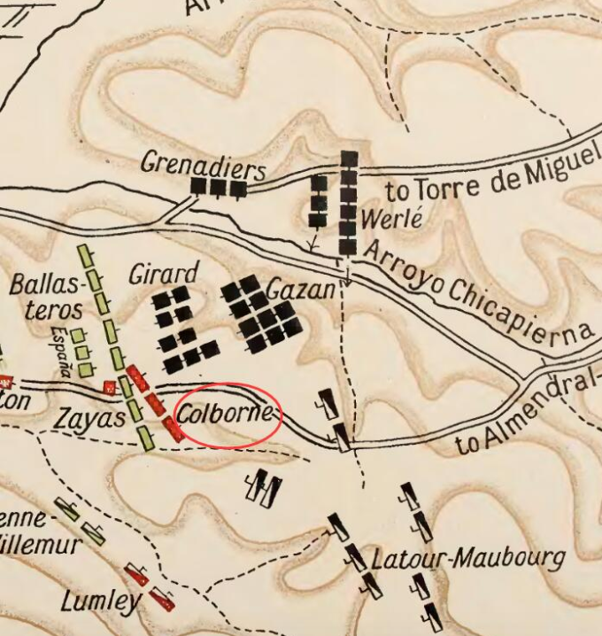 ▲图5.科尔伯恩旅遇袭态势,摘自奥曼《半岛战争史》第4卷,图中红色图块为英军,第31步兵团1营已被标为方阵