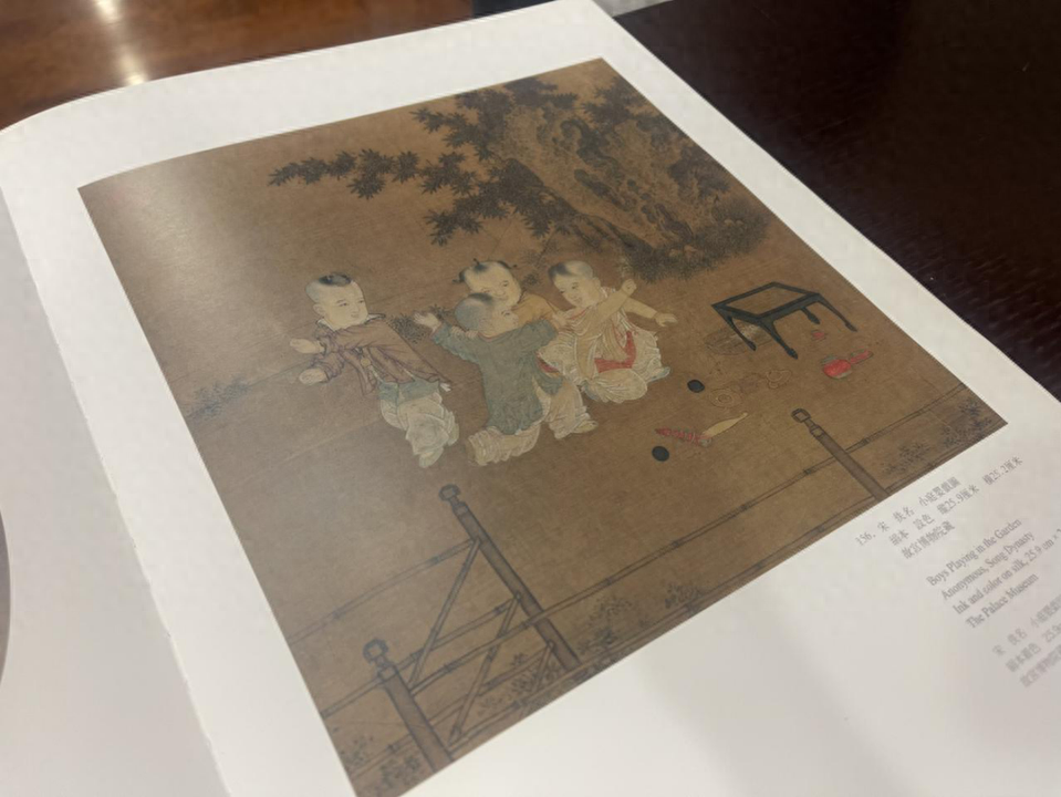 《小庭婴戏图》收录在杭州图书馆馆藏《宋画全集》第一卷第七册,此图绘四个活泼可爱的儿童在竹栏环绕的庭院中游戏,院内右上方湖石点缀、翠竹丛生、小草如茵,画面具有自然生动之趣。右侧地面上散放着小白花、小喇叭、小铜锣、小球等玩具,以烘托宋人趣味游戏运动的主题。