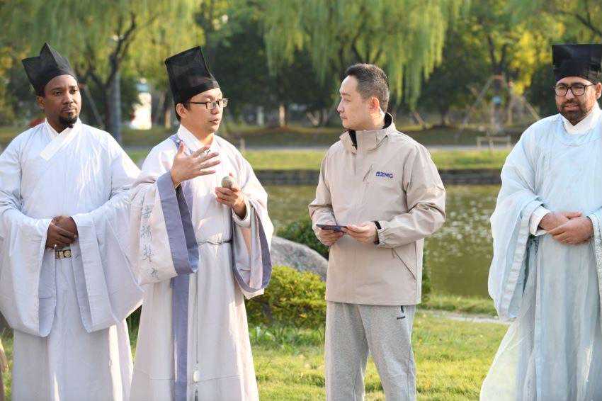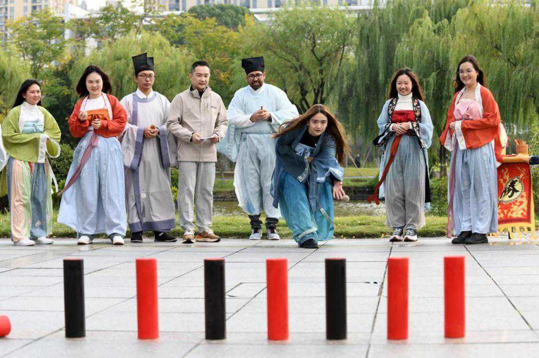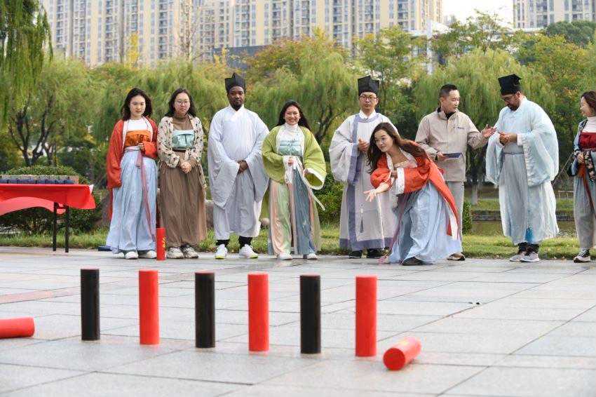 本次活动现场共有来自泰国、马来西亚、乌兹别克斯坦、巴基斯坦、布隆迪、俄罗斯、毛里求斯的8位外籍友人参与。PK环节中,现场的外籍友人被分为了“天行队”和“骏驰队”,两队依次投掷木球,瞄准木柱,使劲投掷。“得分!”有人幸运地击倒红色木柱,顺利加一分。有人不小心击倒了黑色木柱,只能减一分。也有没投中的。大家在PK环节玩得不亦乐乎。经过轮番你追我赶的比试之后,“天行队”的外籍嘉宾拔得头筹,获得了胜利。