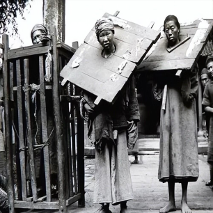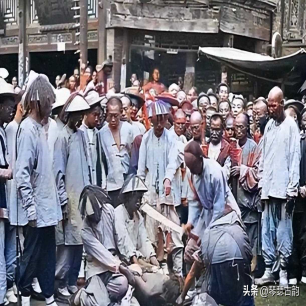 犯人被押往菜市口行刑,这个充满死亡阴影的地方曾是明清时期的著名处刑场。犯人神情木讷,与路人看热闹的表情形成鲜明对比。