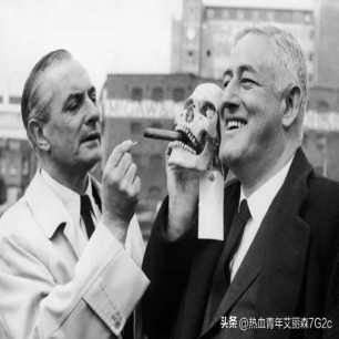 约1962年,英国电影制片人詹姆斯·卡雷拉斯正在为美国电影制片人兼导演威廉·卡斯特手里拿的头骨道具点燃一支雪茄。