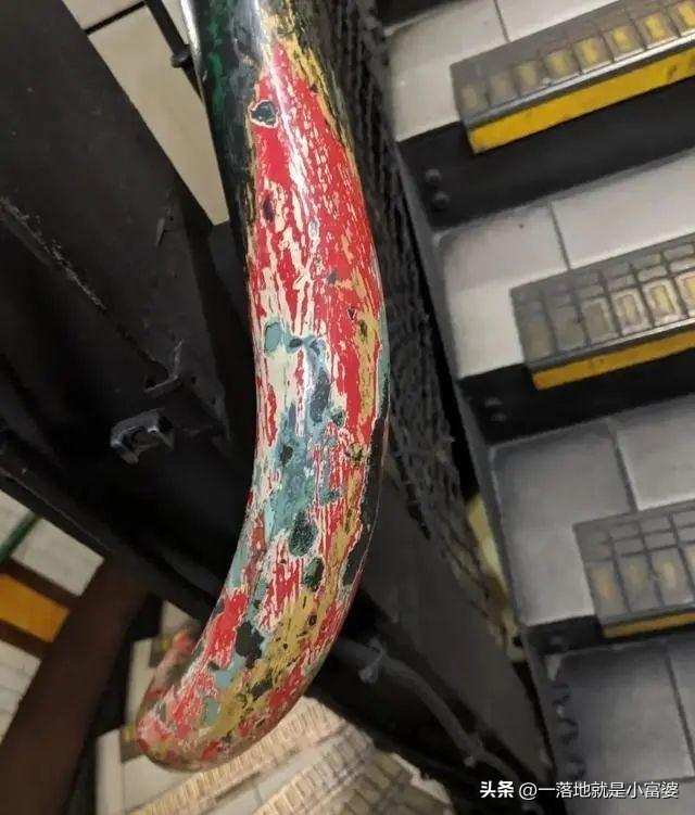 27一个被粉刷了多次的栏杆扶手,可以清楚的看得出来,每次用的油漆颜色都不太一样