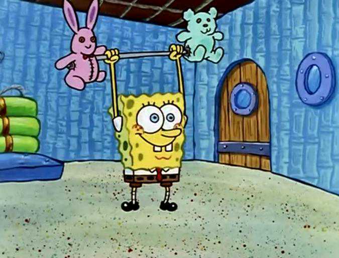 在大家的印象中,海绵宝宝一直是块弱小的小海绵,但是他也有一颗想变得强壮的心,这天海绵宝宝正在家里面锻炼身体呢,他使出吃奶的劲终于把杠铃举了起来(所谓的杠铃不过是两个布娃娃而已)