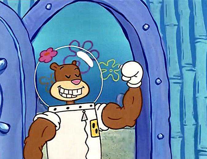 看着珊迪这样强壮的手臂,再看看自己那麦秆一样粗细的手,海绵宝宝决定向她学习一下。就这样,他们来到了珊迪的健身房,先是练拳击,但海绵宝宝根本扛不住珊迪一拳,一个回合下来,他已经有些吃不消了,然后就是长跑,最后就是压手臂,看到练手臂的工具时海绵宝宝心想:这只松鼠是想整死我,于是就一溜烟跑了。
