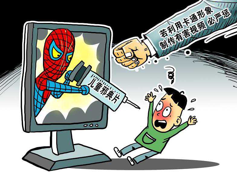 最近,关于儿童邪典片、儿童恐怖动画片流入我国的文章在“朋友圈”刷屏,引发了广大家长的愤怒和恐慌,猪外形的浑身青绿色的医生,拿着一根手臂粗的针管,对小猪佩奇反复地扎来扎去,佩奇疼得不断惨叫、哭泣,两个分别穿着艾莎和蜘蛛人装的幼童版卡通人物,他们偷走爸爸的啤酒然后两人喝醉。接着其中一个小孩跌倒,脸直接撞上桌子,骨头碎裂,鲜血四溅、艾莎的肚子被蜘蛛侠和医生锯开拿出了很多虫子、艾莎同时为绿巨人和小丑生下了宝宝……