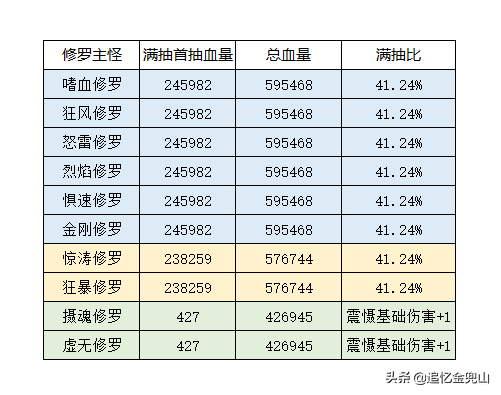 二转142等级,各修罗主怪、喽啰的满抽首抽血量、总血量及满抽比数据如下: