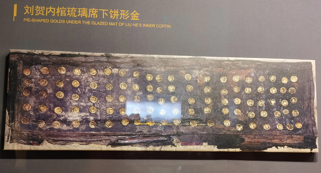 当然,刘贺虽在政治上失意,在生活上还是很奢侈的,毕竟父子两代曾坐过二十几年的王,积累了巨额的财富,在2011出土的南昌海昏侯墓中,考古人员发掘出了一座十几吨重的铜钱山,以及478件合计115公斤的金饼、金板等名贵金器,超过了全国汉墓此前出土金器的总和(注8)。还有,宣帝不准刘贺葬以玉衣,他的墓葬就用了比金缕玉衣还珍贵的金缕琉璃席,其下还放置了一百块金饼,真是有够土豪。