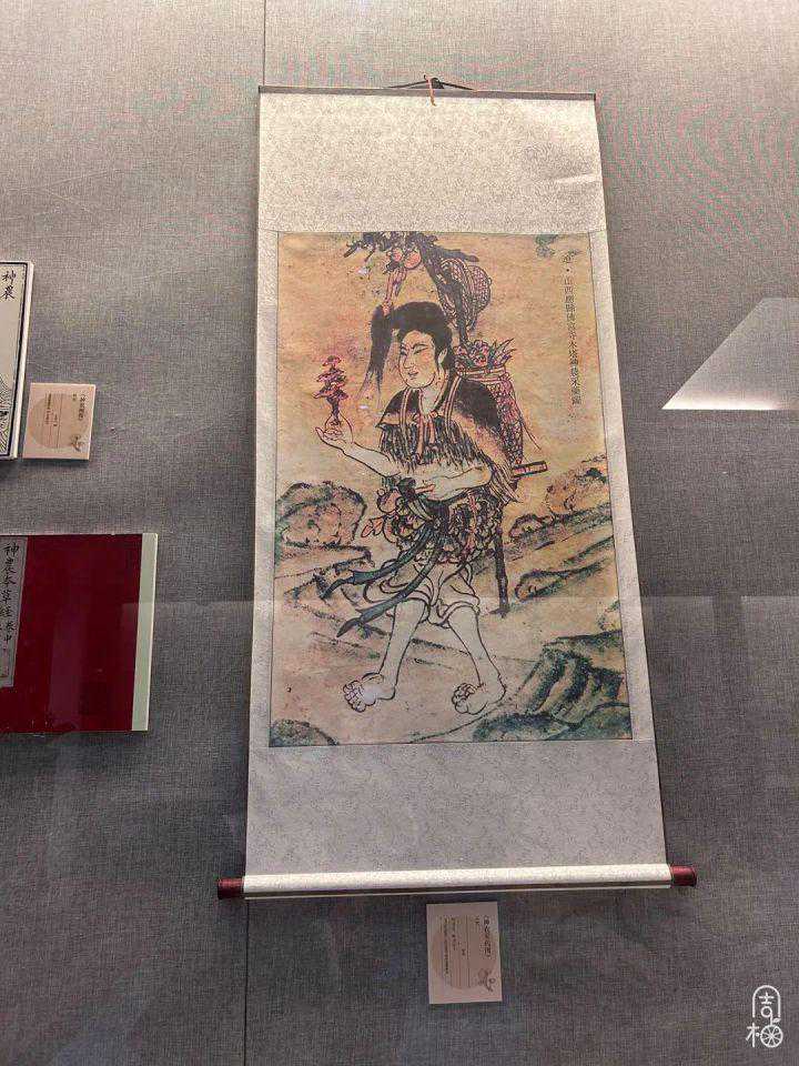 这幅《神农采药图》有啥特点?记者看了下:这幅画长70厘米,宽38.6厘米,线条精细,色彩斑斓,光神农的服饰就有好几种颜色。而神农脸型圆圆的,眉长入鬓,头发乌黑,肩膀上像披着一件“貂裘”,背后背了个药篓,左手拿着药锄,右手举着一根红色灵芝,像是采药后又即兴走了一场“乡村时装秀”。