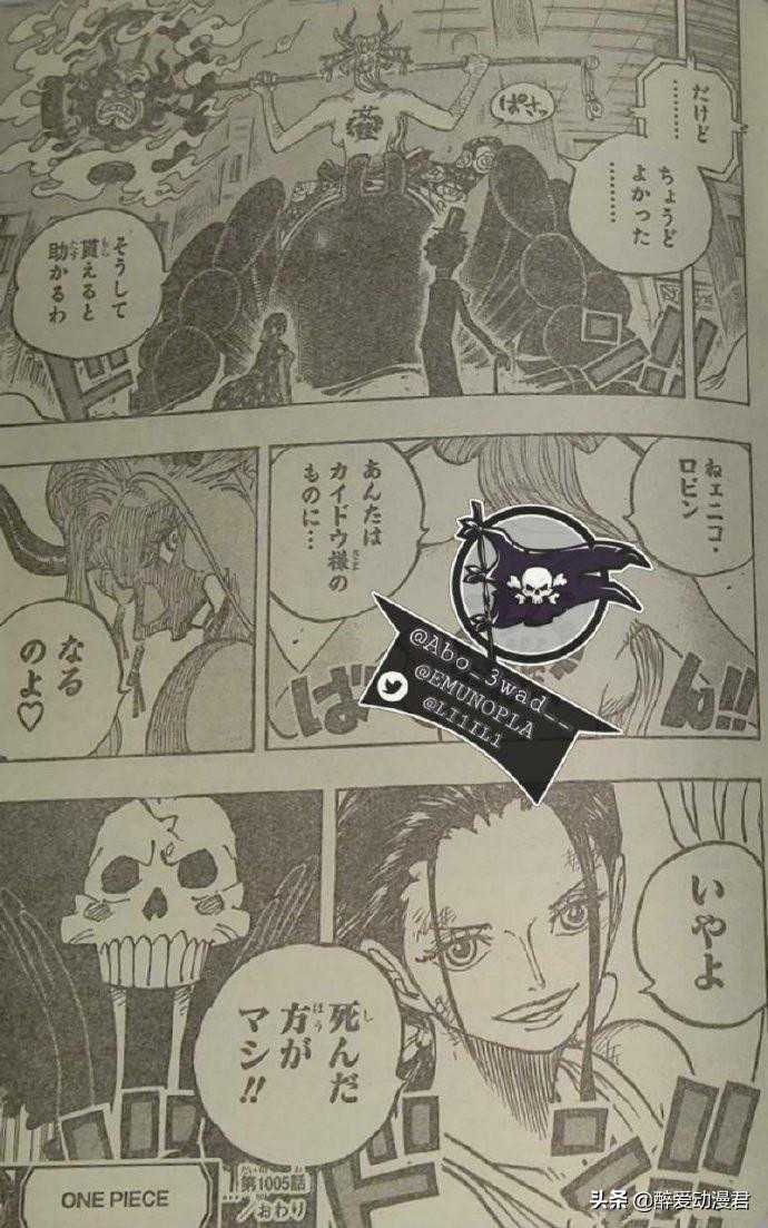 我们知道这周即将更新海贼王最新一期的漫画1005话,目前海贼王漫画已经更新,本话的标题为“恶魔之子”,也就是我们的罗宾了,看来这一话就是罗宾的主场了。而且最有意思的是,这一话的扉页还是我们的卡二同学,正在开心地吃着甜甜圈。