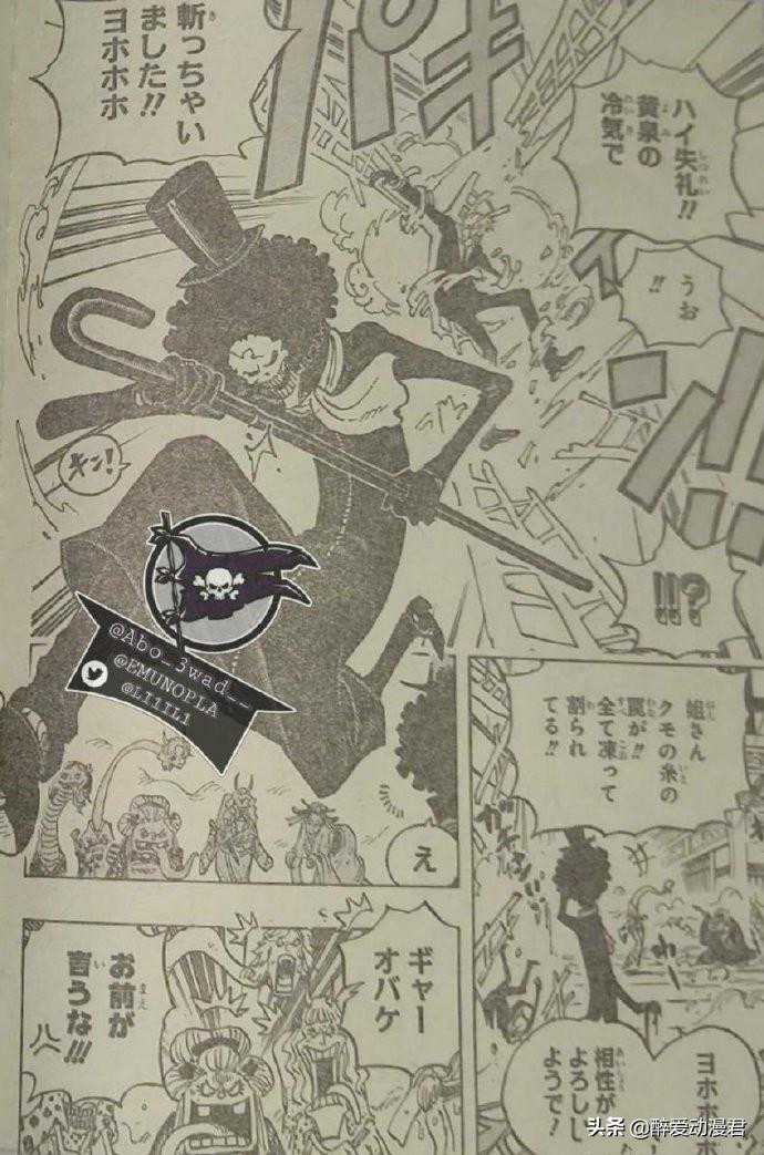 而和罗宾一起出现的布鲁克则是直接出手,用能力冻住了黑玛利亚的蜘蛛丝,直接救下了山治。