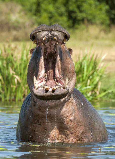 河马可以张开150度的大嘴,轻松咬断独木舟,它奔跑速度可达每小时30公里,是非洲草原上大多数动物的强力对手。