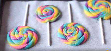 6.烤盘上铺上烘焙纸,放上曲奇,小心地插入纸棒。送进预热好的烤箱180度烘烤20分钟。