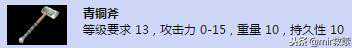 【青铜斧】等级要求13,攻击力0-15,重量10,持久性10