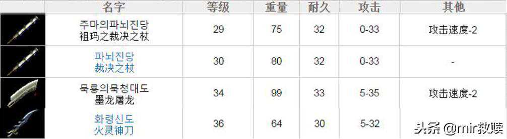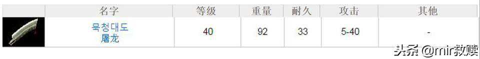【屠龙】:需要等级34,攻击5-35,重量99,持久力33