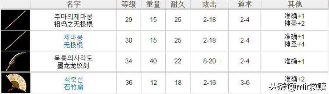 ①我们所说的祖玛级别的武器分别是战士的裁决之杖,法师的骨玉权杖,但它们竟然不是和传统认知上的龙纹一个级别,而是和我们口中所说的道士“沃玛”级武器——无极棍,一个级别,其实这个是对的,只不过盛大国服在此基础上做了修改,将神圣属性给取消了,并且把无极棍需要佩戴的30级换成了需要精神力25才能拿得了。