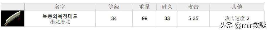 【墨龙屠龙】:需要等级34,攻击5-35,重量99,持久力33,攻击速度-2