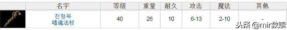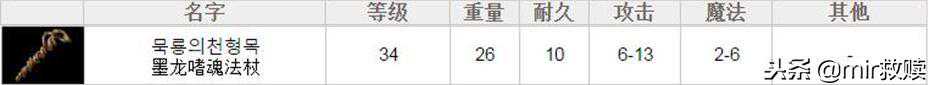 【墨龙嗜魂法杖】:需要等级34,攻击6—13,魔法2—6,重量26,持久10